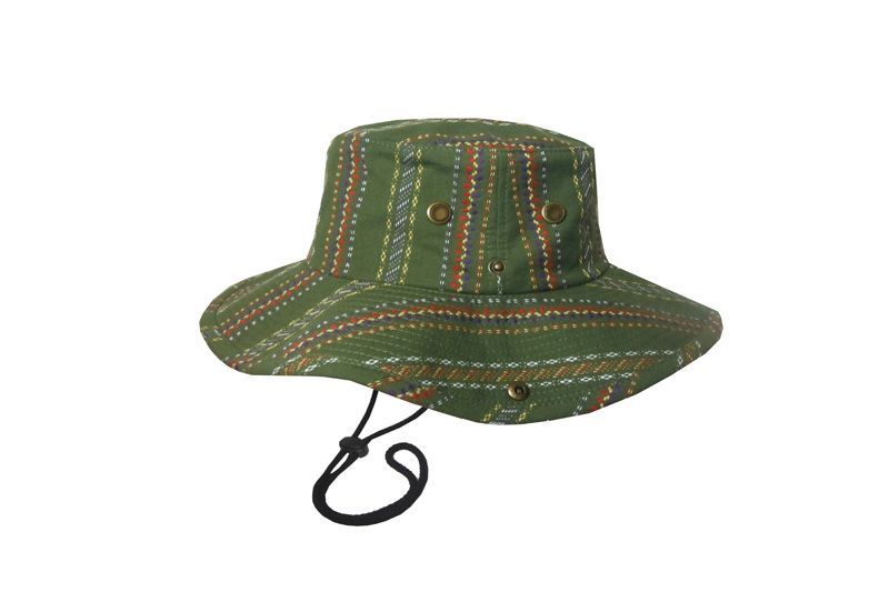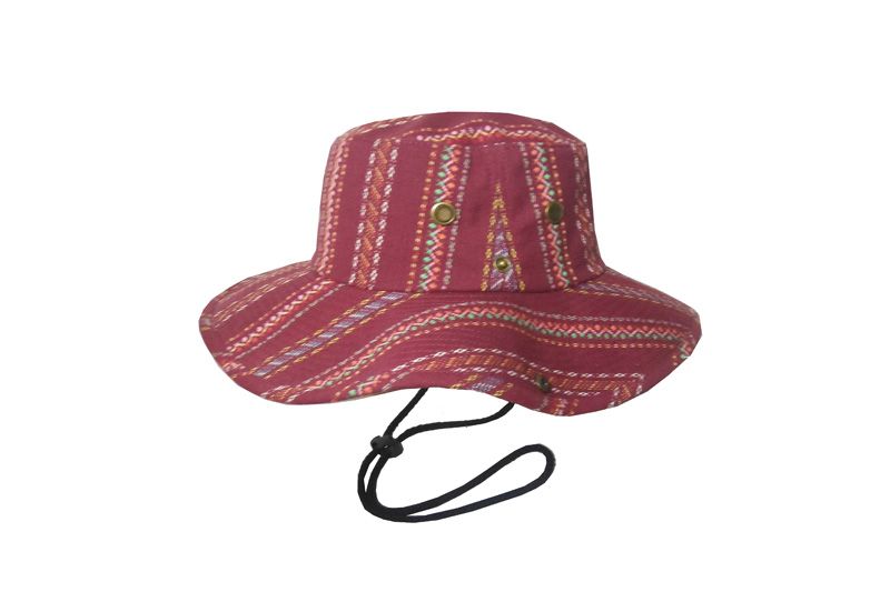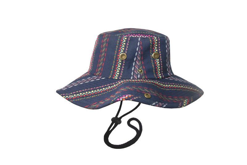 Premium lined cotton with jacquard Baja Aztec pattern, antiqued bronze mesh eyelets, wide brim with snap option, and chin strap with barrel clip.