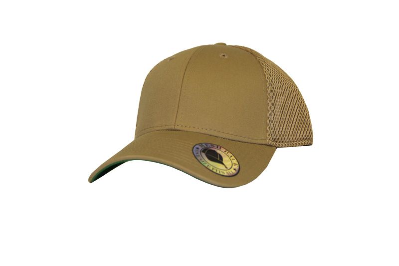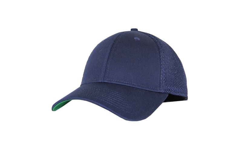 Constructed, 6 panel, cotton twill front with compound stretch to fit capacity mesh back and green under visor to decrease sun glare.